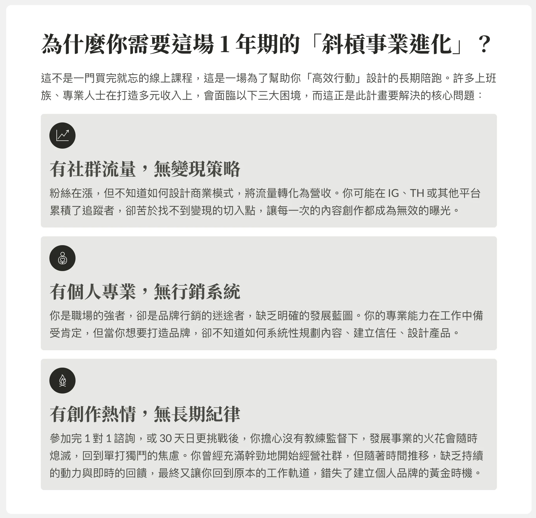 核心價值:幫助你從 0 規劃斜槓策略,梳理品牌定位、開啟首波變現。